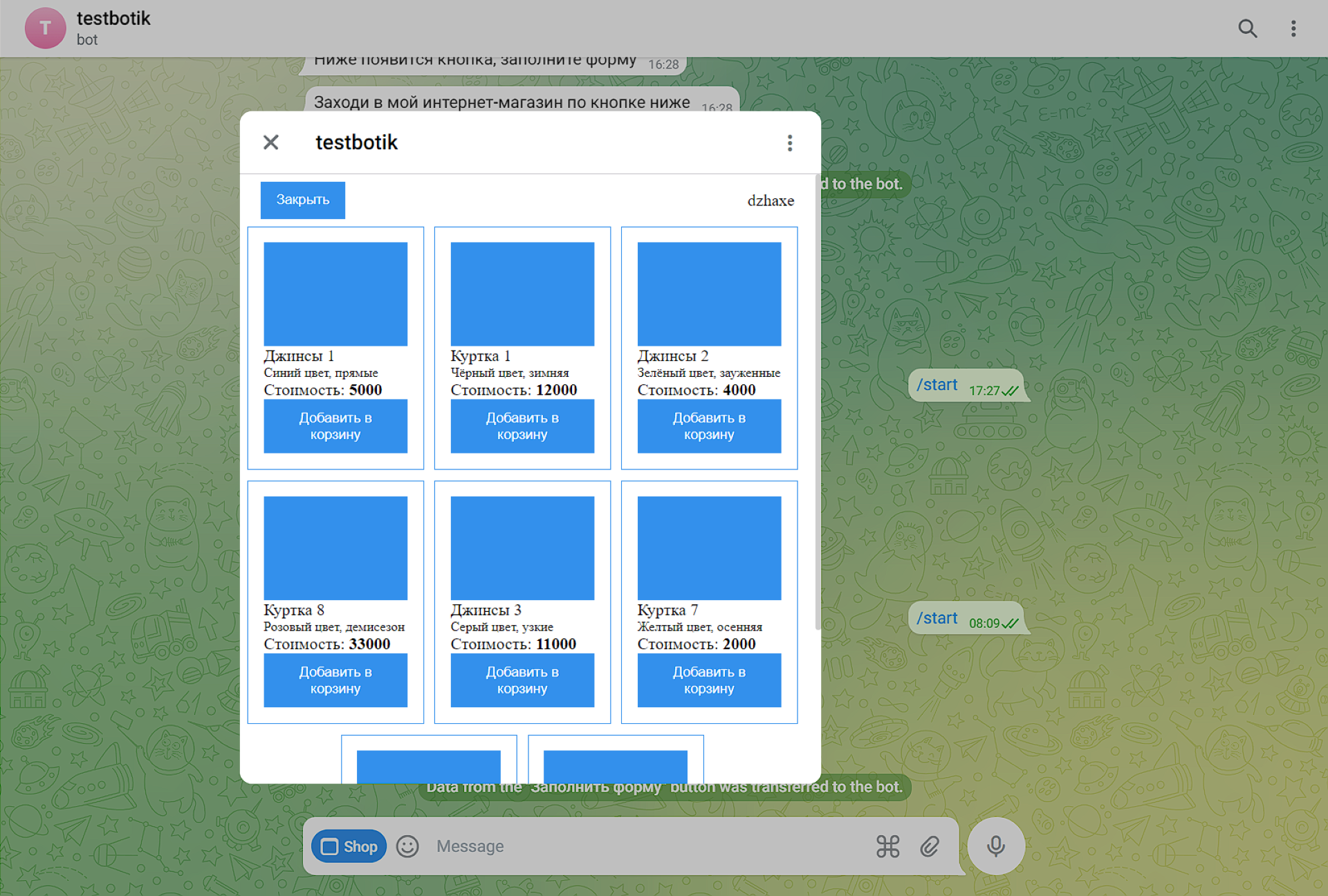 Skills: Javascript, React, Telegram Bot API, NodeJS